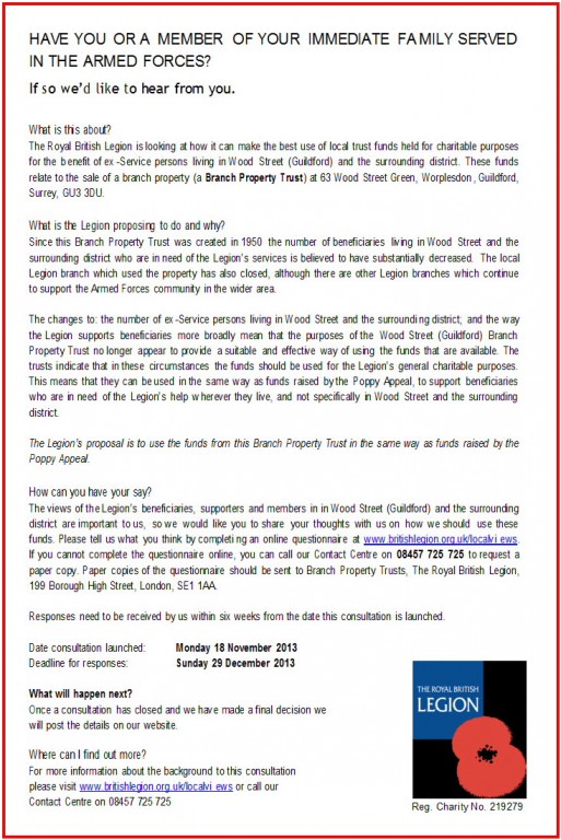 The Royal British Legion is looking at how it can make the best use of local trust funds held for charitable purposes for the benefit of ex-Service persons living in Wood Street (Guildford) and the surrounding district. These funds relate to the sale of a branch property (a Branch Property Trust) at 63 Wood Street Green, Worplesdon, Guildford, Surrey, GU3 3DU.